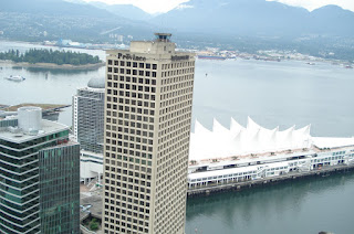 I shared a mozzarella stick appetizer with my friend who was accompanying me on my high altitude journey, and completed my cheesy experience with some lasagna as the main course. Through the angled windows I watched the SeaBus ply its route across the Burrard Inlet from the Vancouver Waterfront to Lonsdale Quay, while several helicopters landed and took off near the rail lines and the Port of Vancouver. As the restaurant slowly rotated the 360 degrees over 60 minutes, I saw the Simon Fraser University atop the peak of Burnaby Mountain, and then Vancouver City Hall and Vancouver General Hospital, before seeing Vancouver Island in the distance, and the downtown core from up close. I noticed someone walking around on the rooftop of my office building and I was intrigued. The tennis court on top of the Holt Renfrew building in which I had encountered Liz Hurley was also unexpected.