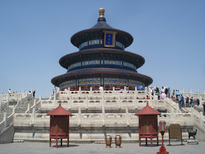 Four elemental temples are scattered around Beijing, with the Temple of Heaven the most spectacular of the quartet. The name of the temple in Chinese is Tiantan, which translates to "Altar of Heaven". On a cloudless summer's day, I wandered its grounds for several hours. As the sun shined up above, beads of sweat graced my forehead. Rivulets of perspiration slowly trickled downwards, tracing the symmetric lines of my face. Effortlessly combining aesthetic principles and cultural values, the design of the temple was similarily well thought out. Squares, representing earth, and circles, representing heaven, serve as the chief design motifs for impressive structures within the temple complex such as the Hall of Prayer for Good Harvests, the Imperial Vault of Heaven, the Echo Wall, and the Circular Mound Altar.