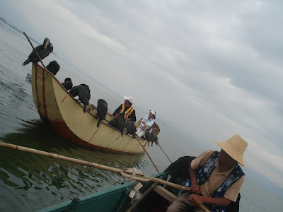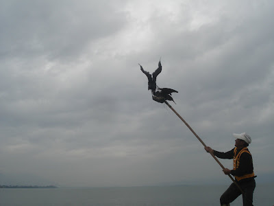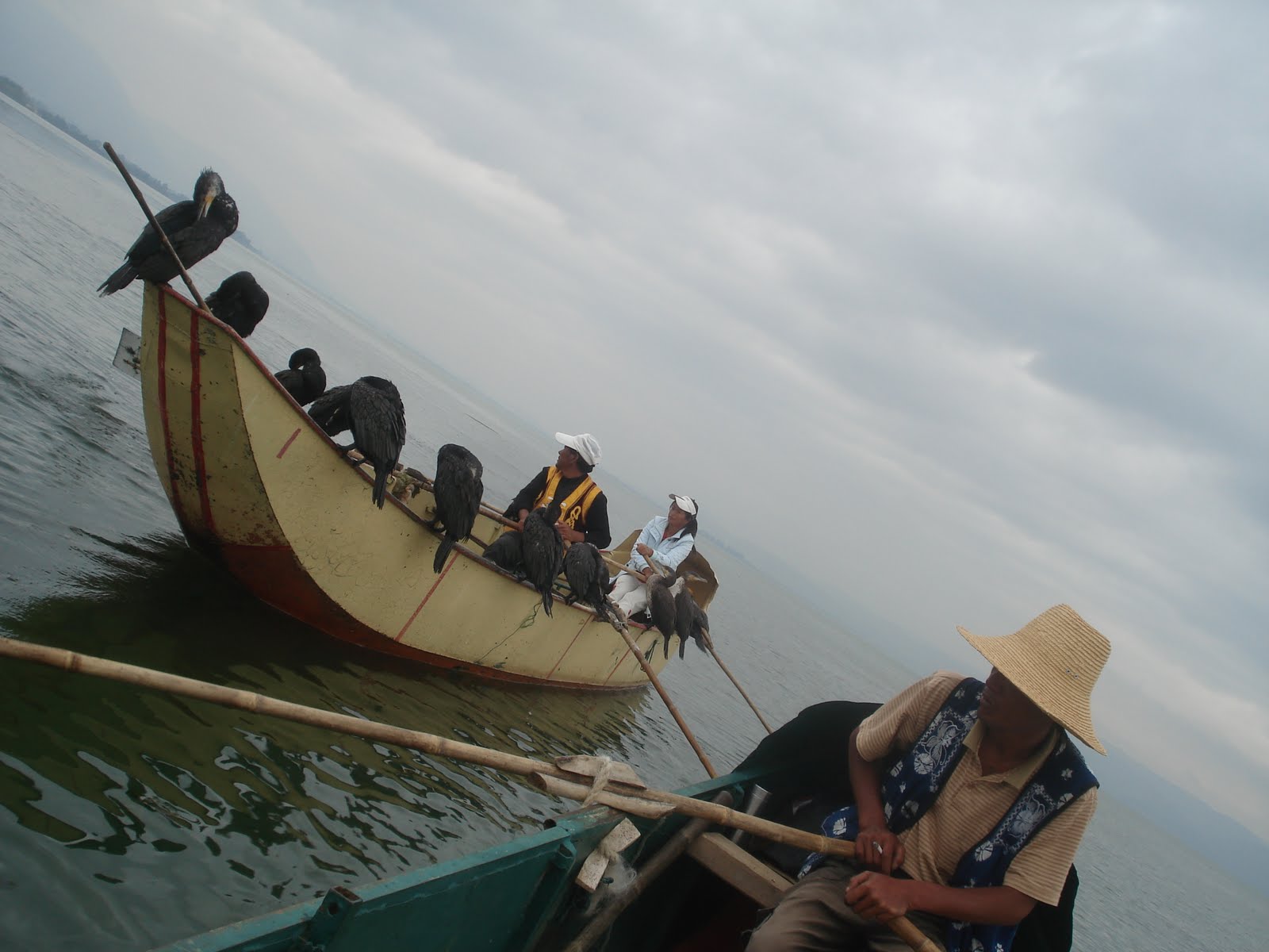 A fleet of two rowboats set sail on to the waters of Lake Erhai, near the town of Dali in southwestern China. Evenly distributed among the boats were two oarsmen. One boat also carried a fisherman from the indigenous Bai minority and ten cormorants. The other carried our intrepid protagonist. The big seabirds were perched on the edge of the fisherman's boat. When fish were in the vicinity the cormorants would dive from the surface into the depths beneath to capture their unsuspecting prey.