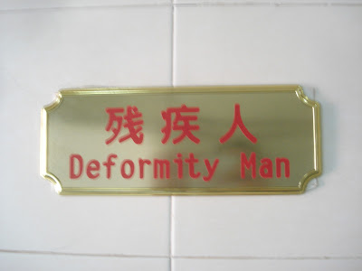 In modern parlance, the Western world refers to a person who has a physical or mental limitation as disabled. In less politically correct times when secretaries were called secretaries, disabled people were called handicapped. In China, this is taken one step further. Bathroom stalls reserved for disabled persons have the words "Deformity Man" prominently emblazoned on them. These are of particular use to me as they are often the only Western style toilet option available amidst a sea of fetid trenches, holes, or other open pits in which to deposit waste. I enjoy squatting during emergencies, but when I have enough time I prefer to take a seat.
