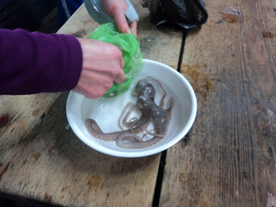 After careful inspection, we selected a couple of octopi. I had wanted to share one, but Zeki insisted on two. He wanted to make sure that we each got a head. The fishmonger put the octopus in a plastic bag partially filled with water and handed it to me. We walked through a narrow opening between several stalls at one corner of the market and headed into a basic restaurant attached to the fish market. A lady roughly grabbed my octopi. I followed her into the back and watched in stunned silence as she quickly chopped off the tentacles and put the various squirming pieces onto a dish.