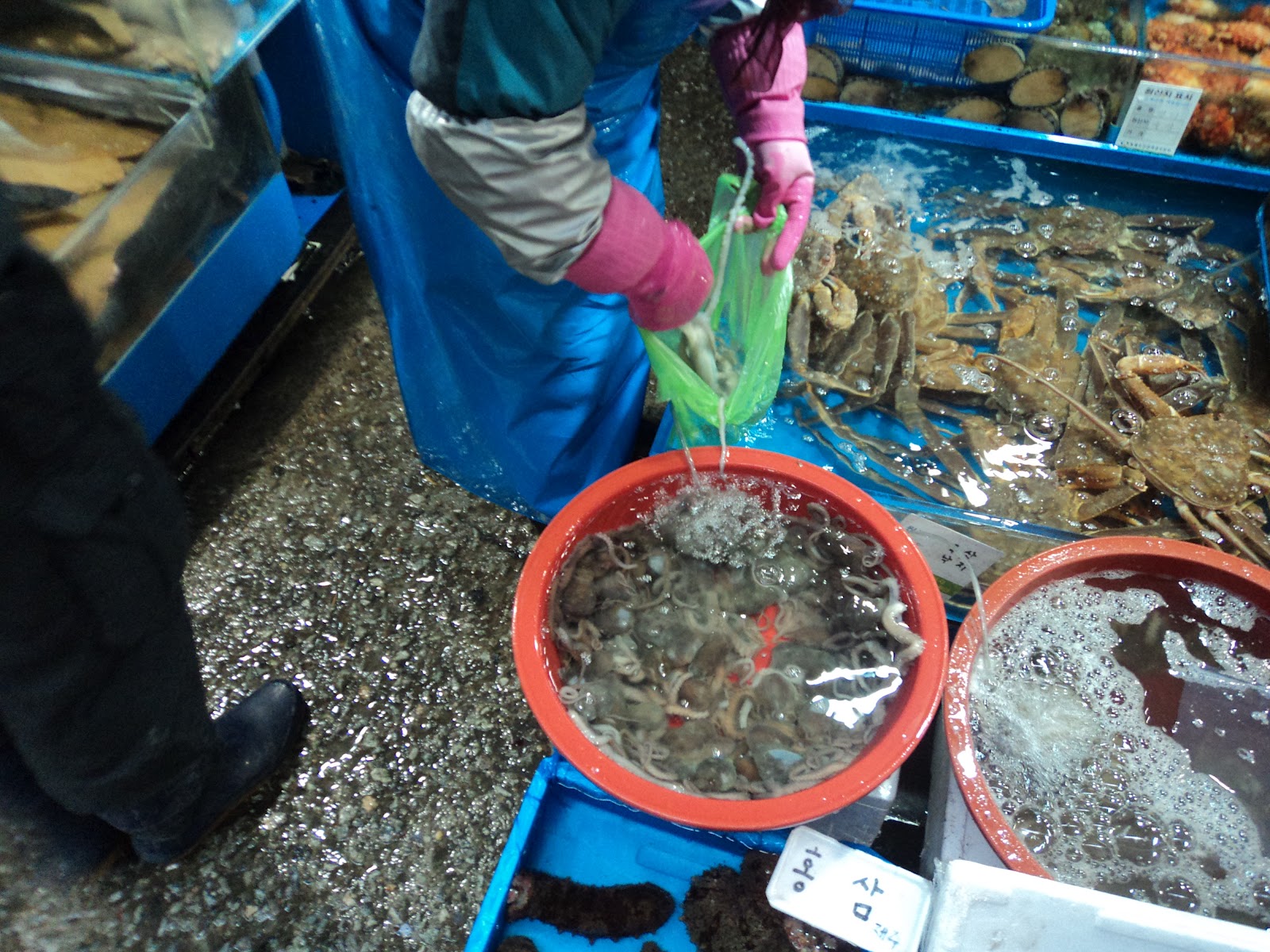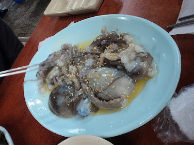 After eating almost everything imaginable under the sun during my China years, I moved from inanimate to animate objects in Korea. At the Noryangjin Fish Market in Seoul, dozens of fishmongers offer mysterious creatures of the deep to the public for immediate consumption. I was accompanied by my friend Zeki. As we exited the Noryangjin subway and turned towards the overhead walkway leading to the fish market, Zeki mentioned that I should have cash on hand as they probably do not accept credit cards. "No they don't." confirmed a foreign passerby who appeared out of nowhere for that brief moment as if performing a cameo in a movie.