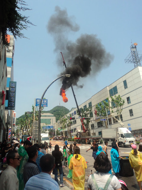 Chuncheon hosts an international mime festival each year. Foreigners in Korea who do not fluently speak the local tongue soon become accomplished mimes themselves, so I was interested in seeing the abilities of some of my peers. The mime portion of the festival was rather boring though, with only a few moderately skilled performers on hand. The scene stealer was a spectacular set piece that dangled in the skies. A fireball was lifted above the crowds by a crane, held in place by a barely visible cable that did not hinder the effect of the great ball of fire.