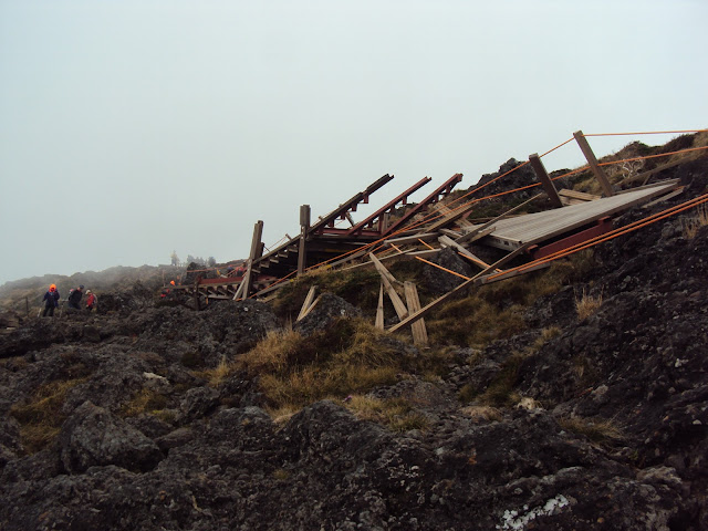A heavy storm had recently hit Jeju, so the staircase up to the top of the mountain was a mangled pile of wooden debris. The rest of the trail was in good condition, with a couple of rest areas in between giving us a chance to mingle with the brightly dressed community of mature Koreans who adore hiking up mountains. One old timer kept pointing me out to his companions in between slurping his cup of instant noodles and taking swigs of soju, perhaps trying to recollect which magazine cover or billboard he had seen me on before.