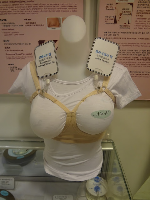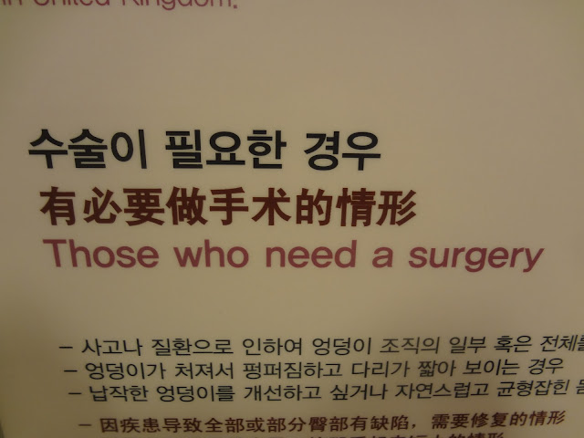 At the reception area a mother and daughter pair were solemnly awaiting their consultation. One of the three identical receptionists pointed out the museum entrance to me. It was quite small but informative, as eyes, nose, hair, face, breasts, hips, and bottoms were all covered. There were diagrams, tools of the trade, documentary videos, and even a few hands on exhibits demonstrating how certain body parts could be augmented.