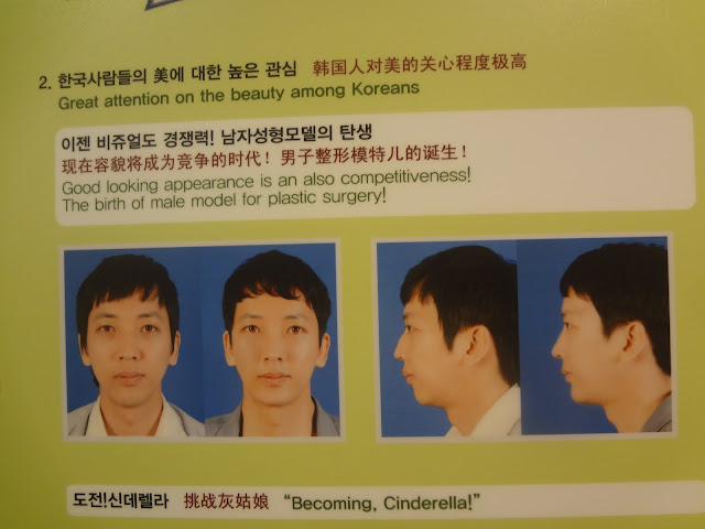 A glass box where patients drop pieces of their shaved off jawlines eerily quoted a Korean proverb about tigers shedding their skin as they enter the afterlife. The descriptions about each form of surgery frequently mentioned how Western (eg white) standards of beauty appealed to the many Koreans who are intoxicated with improving their appearance to gain a competitive edge over others. However with a few more visits to BK Hospital and its ilk the others may end up looking just like them, nullifying their advantage.