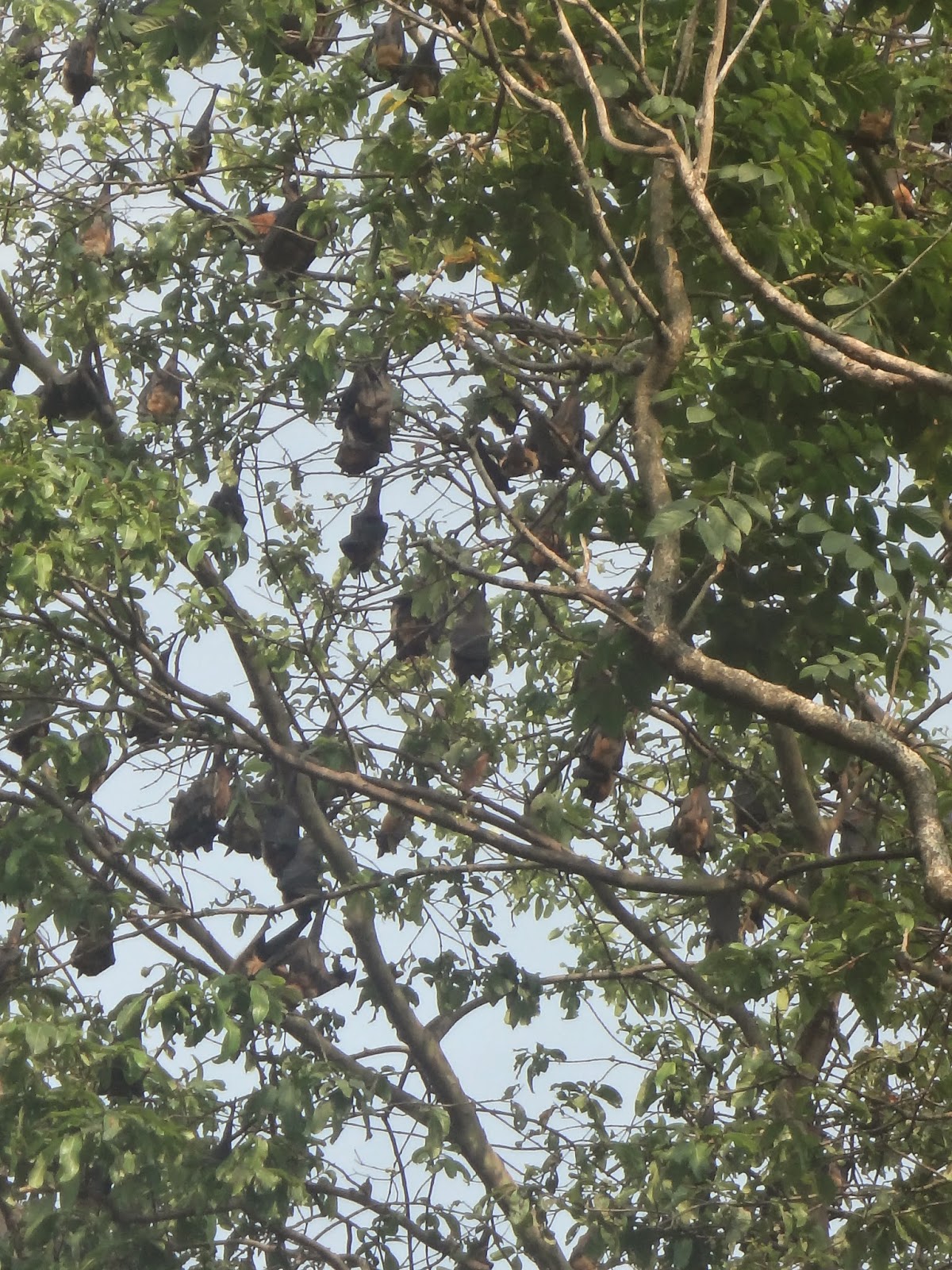 I was astounded by seeing so many of these creatures of the night out in pure daylight, as usually I only encounter them in caves or other dimly lit locations. I escaped unharmed and later found out that they are fruit bats of the Indian Flying Fox variety, addicted to fruit juice and capable of swallowing pieces of fruit in their entirety.