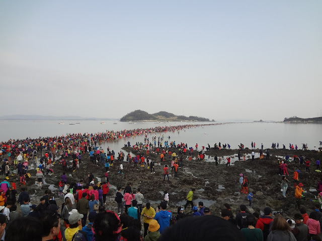 Some of the teachers donned faux Moses beards and carried a staff to complete the scene as they trudged across the 2.8 kilometre stretch of land that emerged from the sea, connecting Jindo to the even smaller island of Modo. A lot of people did not bother to walk across the whole way, preferring to stop and collect the seaweed, abalone, and starfish that surfaced once the sea floor was revealed.